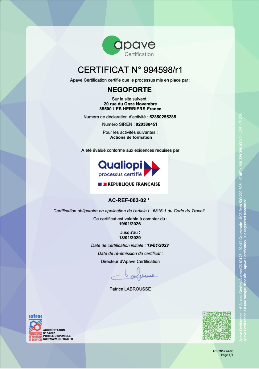 Boostez votre performance commerciale TAUX DE SATISFACTION DE NOS APPRENANTS À L'ISSUE DES FORMATION : 0% Previous Next Déclaration d’activité enregistrée sous le numéro 52850255285 auprès du Préfet de région des Pays de la Loire.Cet enregistrement ne vaut pas agrément de l’État. | Contact Envelope Linkedin | MENTIONS LEGALES Mentions légalesCGV 2025Certificat QUALIOPI